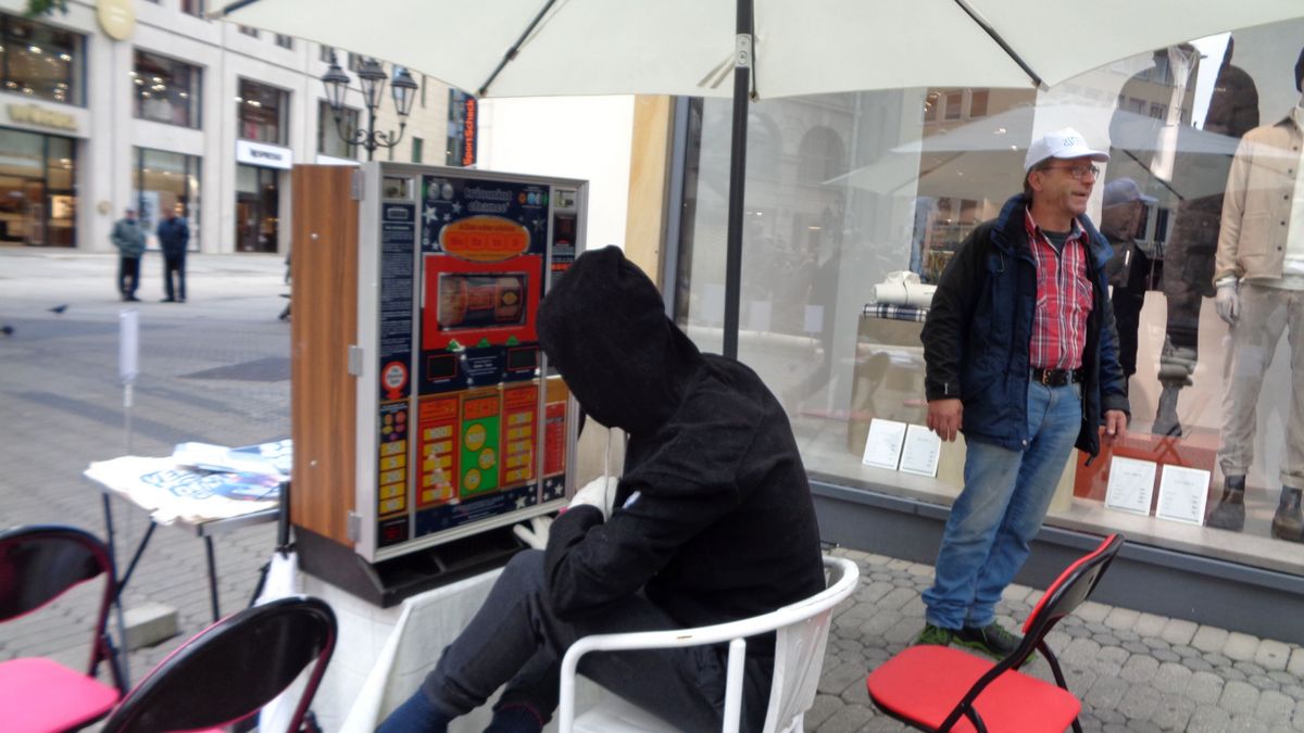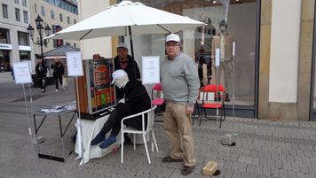 Wir hatten in Nürnberg am Ludwigsplatz gegenüber des in Nürnberg wohlbekannten Brunnens "Ehekarussel" einen Infostand mit ausliegendem Infomaterial zur Glücksspielsucht aufgebaut.